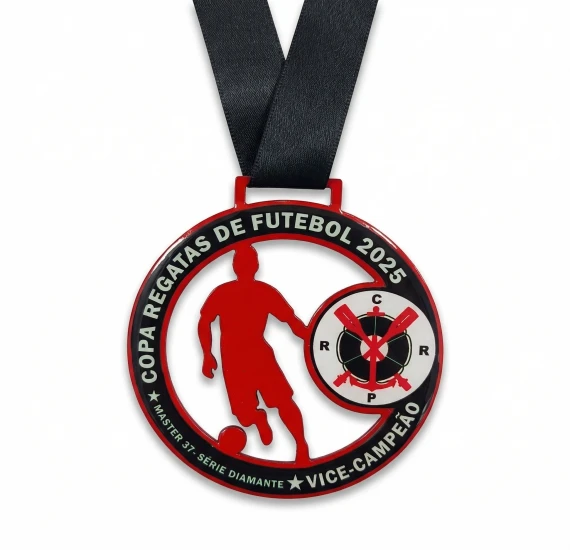 Medalha personalizada de 85mm produzida em ferro modelo futebol, com adesivo exclusivo e acabamento resinado de alto brilho. Uma peça mais pesada e robusta, ideal para eventos que exigem presença, durabilidade e valorização da conquista.