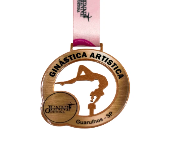 Medalha personalizada de 80mm produzida em ferro modelo ginástica, com adesivo exclusivo e acabamento resinado de alto brilho. Uma peça mais pesada e robusta, ideal para eventos que exigem presença, durabilidade e valorização da conquista.