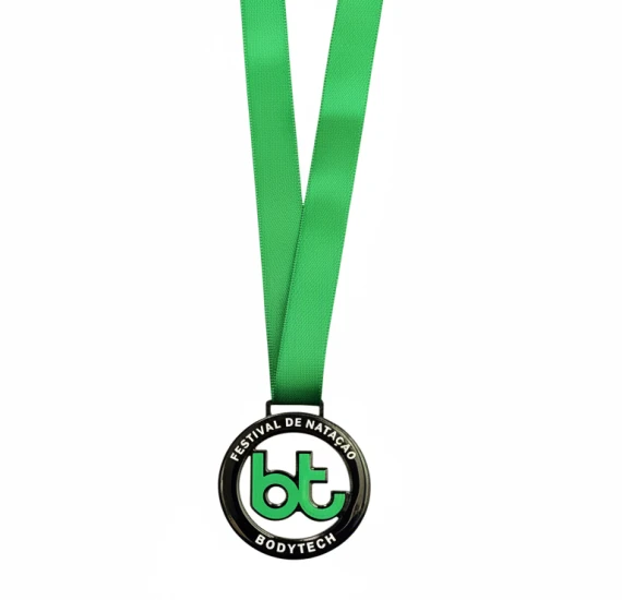 Medalha personalizada de 70mm produzida em ferro de formato circular, modelo BodyTech, com adesivo exclusivo e acabamento resinado de alto brilho. Uma peça mais pesada e robusta, ideal para eventos que exigem presença, durabilidade e valorização da conquista.