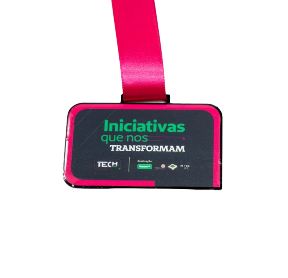 Medalha personalizada de 80x50mm produzida em ferro de formato retangular, com adesivo exclusivo e acabamento resinado de alto brilho. Uma peça mais pesada e robusta, ideal para eventos que exigem presença, durabilidade e valorização da conquista.