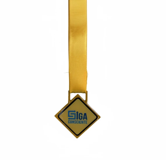 Medalha personalizada de 65x65m produzida em ferro, formato de losango, com adesivo exclusivo e acabamento resinado de alto brilho. Uma peça mais pesada e robusta, ideal para eventos que exigem presença, durabilidade e valorização da conquista.