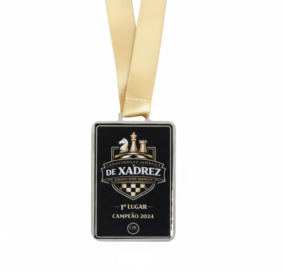 Medalha personalizada de 45x65mm produzida em metal chapa fina de formato retangular, com arte em adesivo e acabamento resinado de alto brilho. Uma opção leve, moderna e com excelente custo-benefício para eventos esportivos, escolares e corporativos.