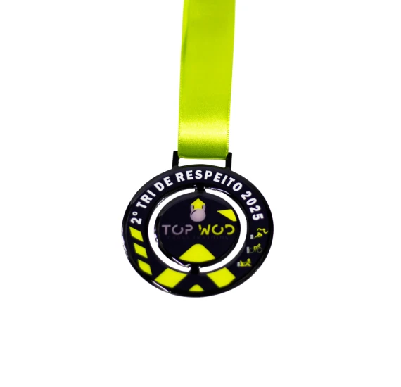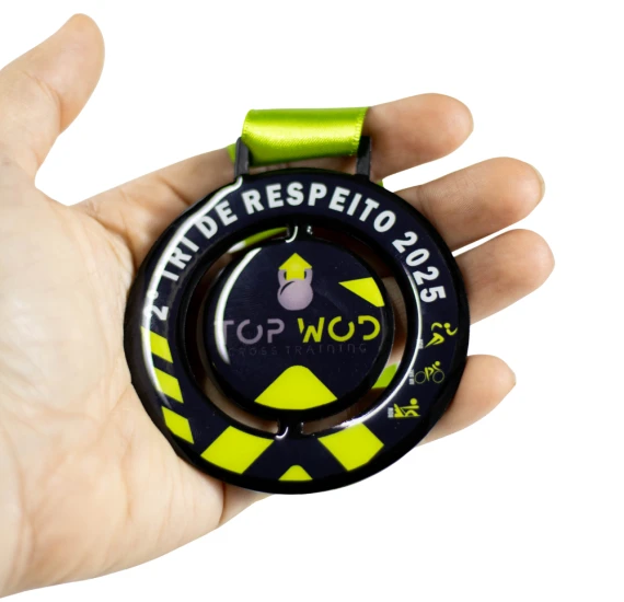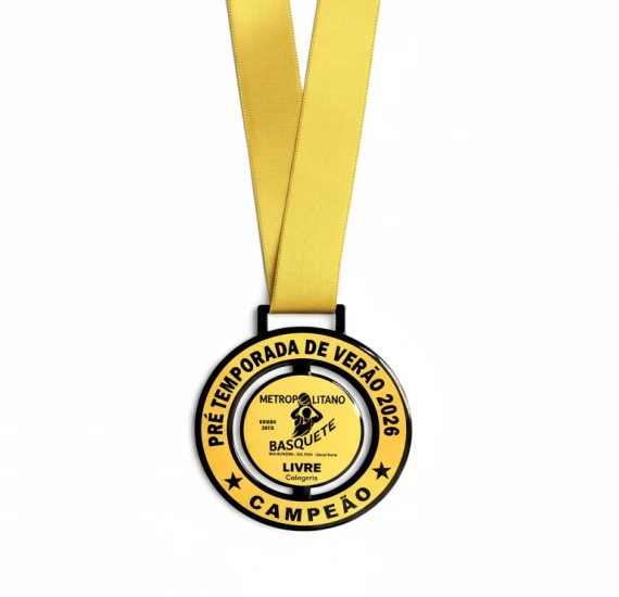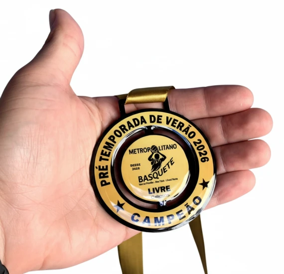 Medalha personalizada de 70mm produzida em ferro de formato circular vazado, com adesivo exclusivo e acabamento resinado de alto brilho. Uma peça mais pesada e robusta, ideal para eventos que exigem presença, durabilidade e valorização da conquista.