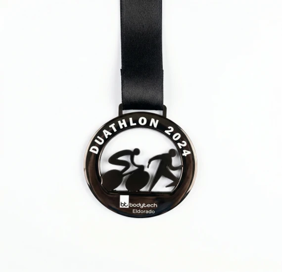 Medalha personalizada de 65mm produzida em ferro modelo duathlon, com adesivo exclusivo e acabamento resinado de alto brilho. Uma peça mais pesada e robusta, ideal para eventos que exigem presença, durabilidade e valorização da conquista.
