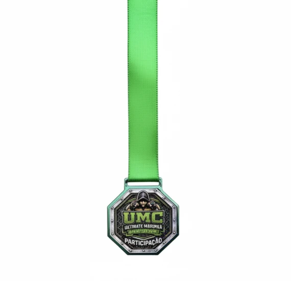 Medalha personalizada de 50x50mm produzida em ferro de formato octogonal, com adesivo exclusivo e acabamento resinado de alto brilho. Uma peça mais pesada e robusta, ideal para eventos que exigem presença, durabilidade e valorização da conquista.
