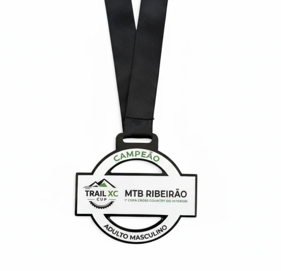 Medalha personalizada de 90X85mm produzida em ferro de formato vazado triangular, com adesivo exclusivo e acabamento resinado de alto brilho. Uma peça mais pesada e robusta, ideal para eventos que exigem presença, durabilidade e valorização da conquista.