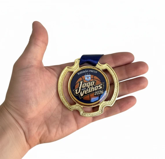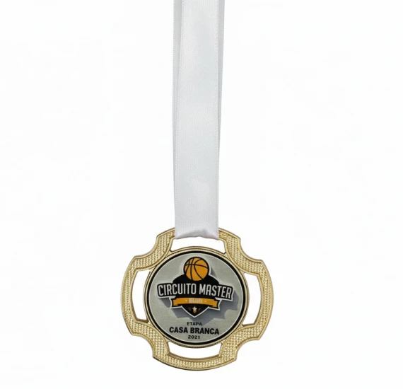 Medalha em zamac de 75mm com personalização em adesivo vinílico laminado de alta qualidade e cobertura em resina cristal, garantindo brilho intenso e acabamento premium. Ideal para premiações que exigem qualidade e destaque.